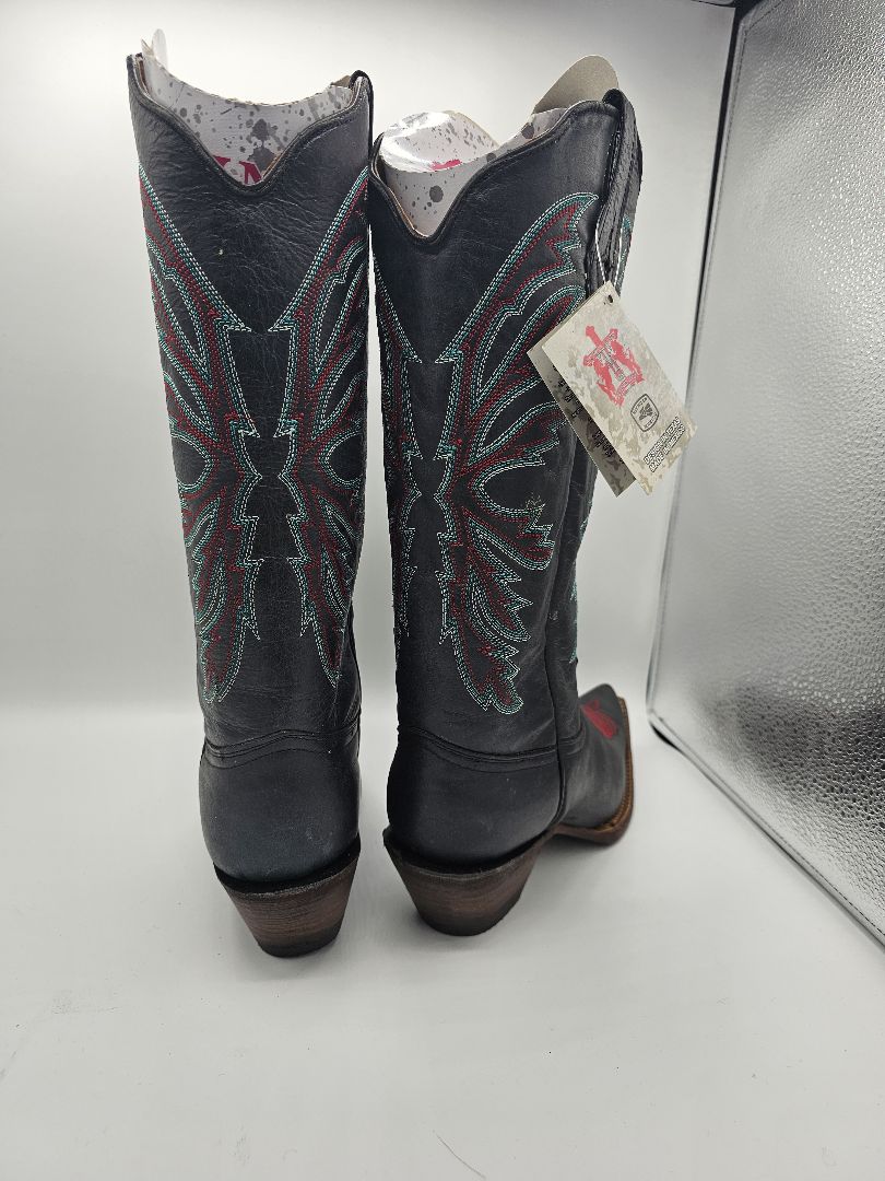 Step out in authentic Western style. These stunning boots are crafted from genuine black leather and feature striking, intricate embroidery in vibrant Teal/Turquoise and Crimson Red.