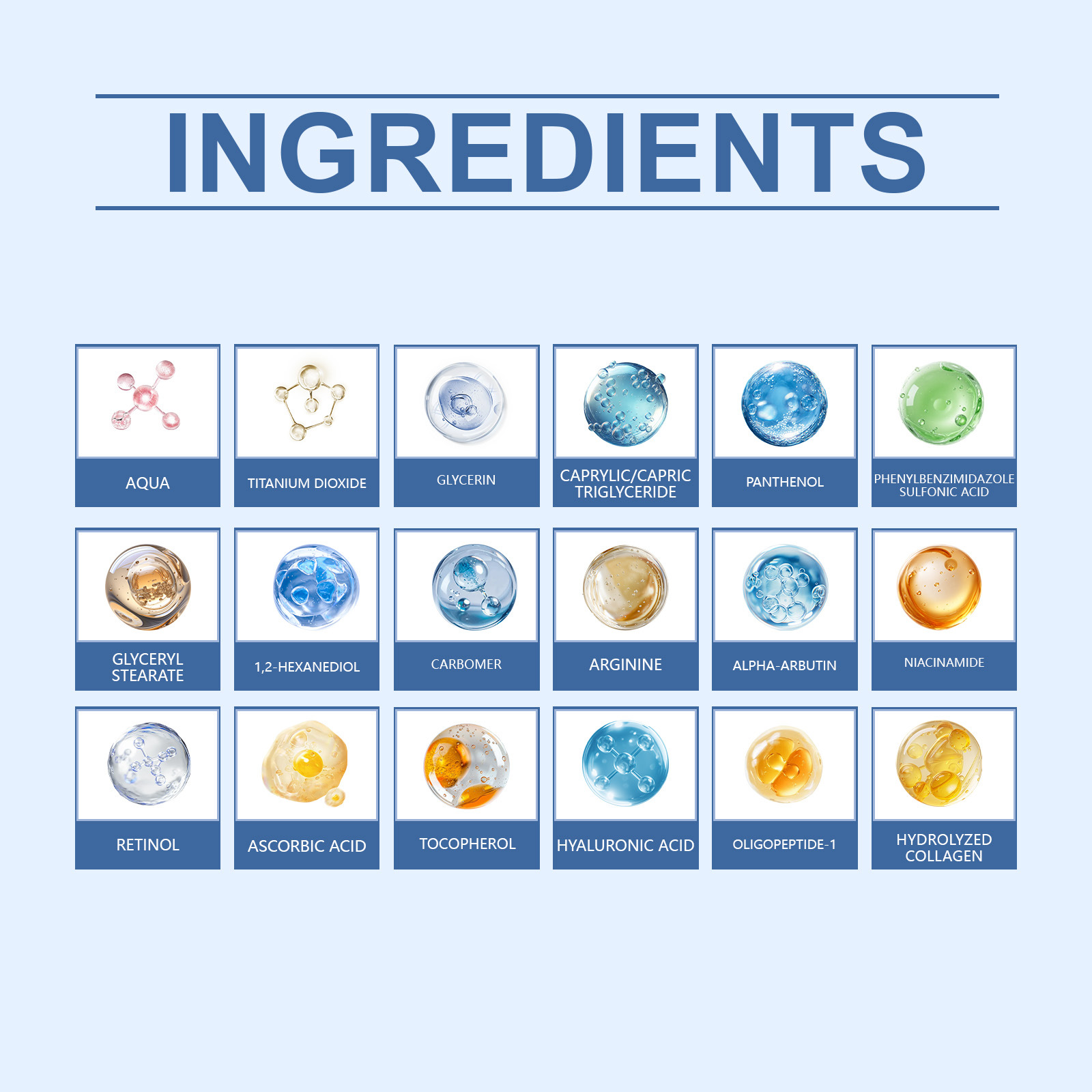Ingredients: water, titanium dioxide, glycerol, caprylic/capric triglyceride, panthenol, phenylbenzimidazole sulfonic acid, glycerol stearate, 1,2- hexanediol, carbomer, arginine, α-arbutin, nicotinamide, retinol, ascorbic acid (vitamin C), tocopherol (vitamin E), hyaluronic acid, oligopeptide -1.
