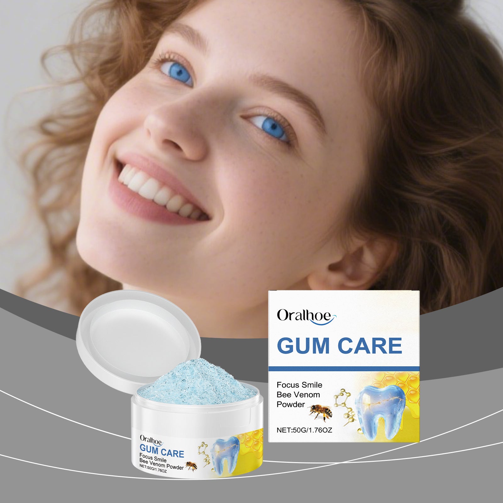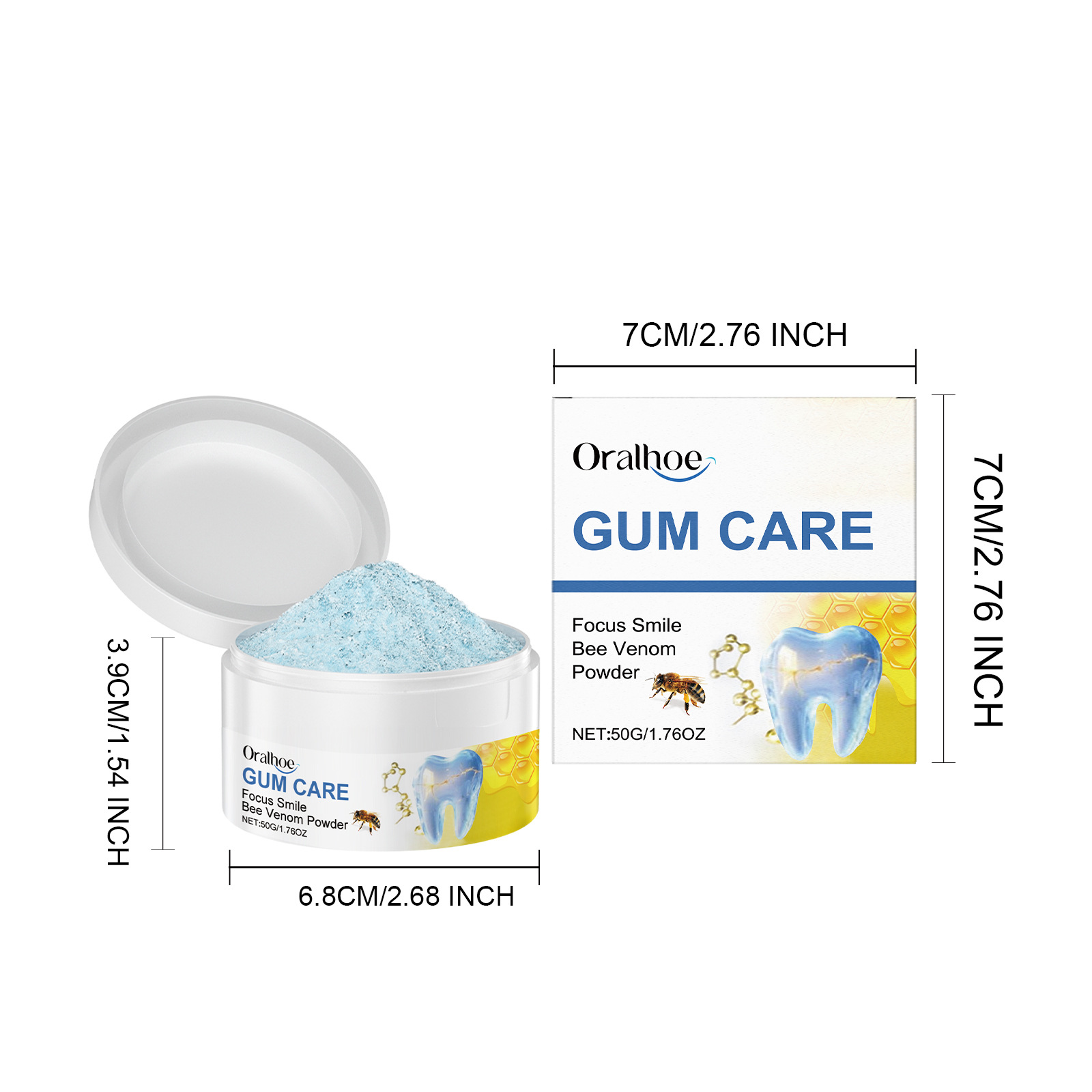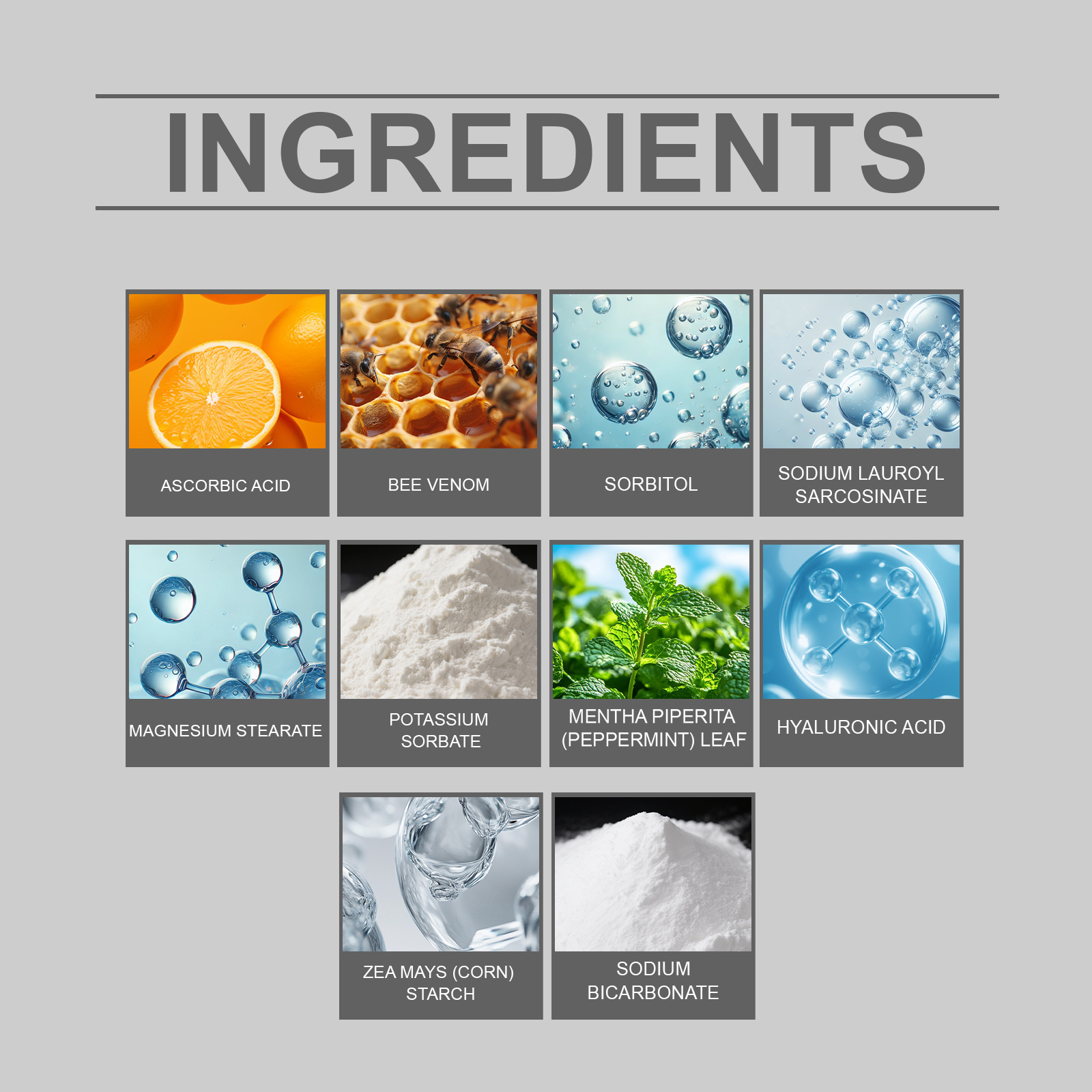 Ingredients: sodium bicarbonate, corn starch, sorbitol, magnesium stearate, sodium lauryl sarcosinate, mint extract, potassium sorbate, bee venom, hyaluronic acid, ascorbic acid (vitamin C)