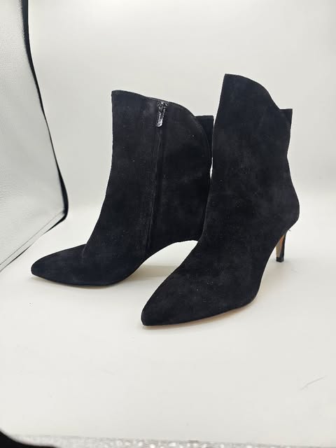 These classic black ankle boots feature a luxurious genuine suede upper and a sleek pointed toe. They are designed for comfort and style with a manageable kitten heel (approx. 1.5-2 inches). A convenient side zipper allows for easy wear. The back heel features a slightly curved/scalloped top line for a comfortable fit around the ankle and a small, recognizable on the back of the heel. Perfect for work, dress, or casual everyday wear.