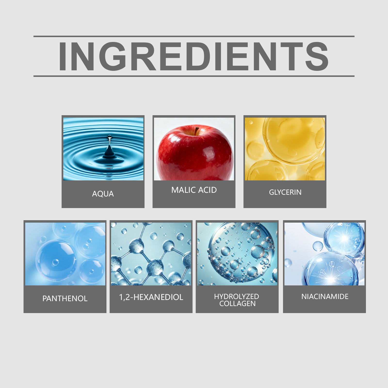 Ingredients: water, malic acid, glycerin, panthenol, 1,2- hexanediol, hydrolyzed collagen, nicotinamide.