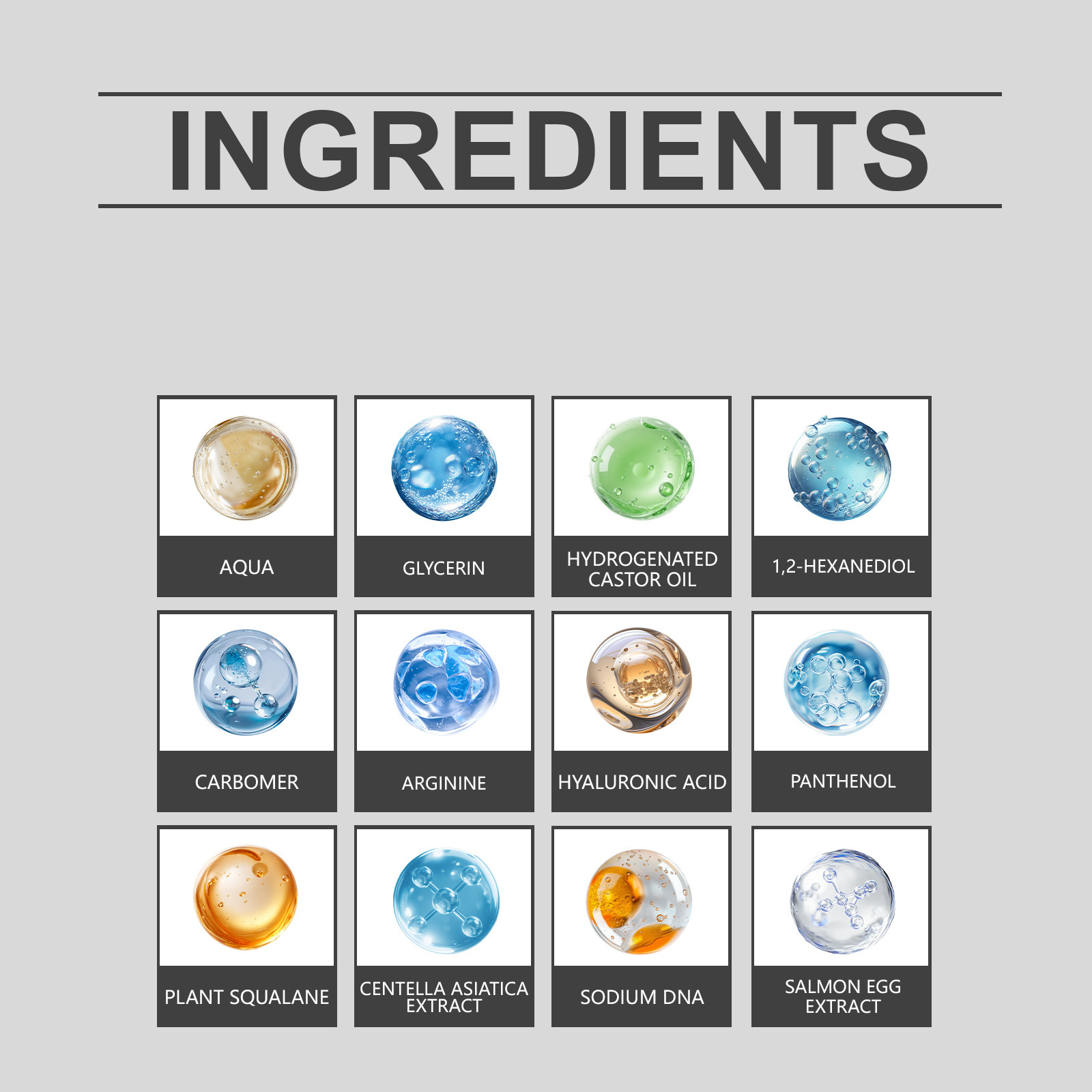 Ingredients: water, glycerin, hydrogenated castor oil, 1,2- hexanediol, carbomer, arginine, hyaluronic acid, panthenol, plant squalane, Centella asiatica extract, DNA sodium, salmon egg extract.