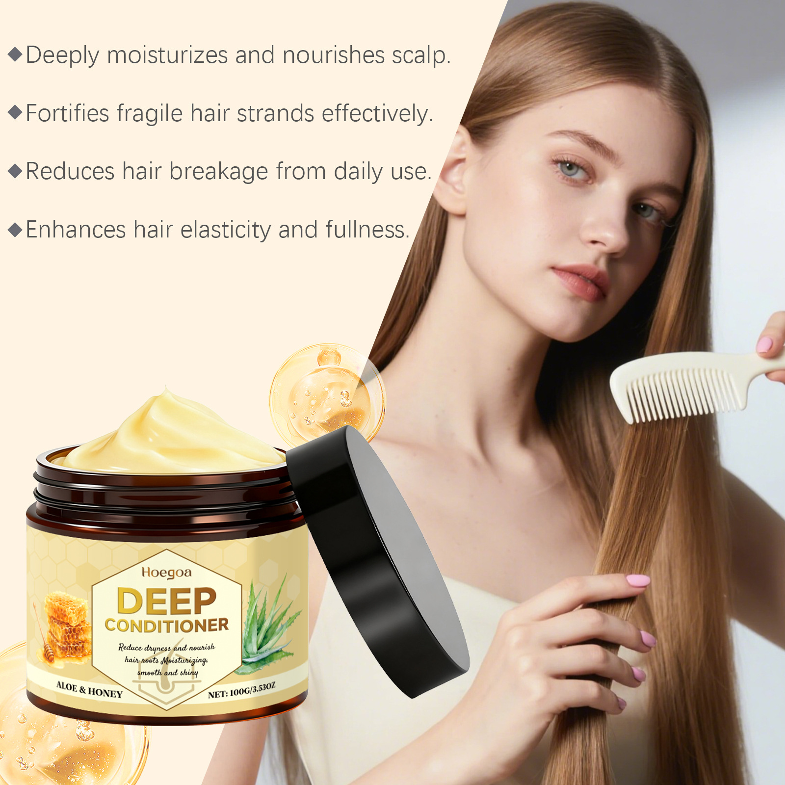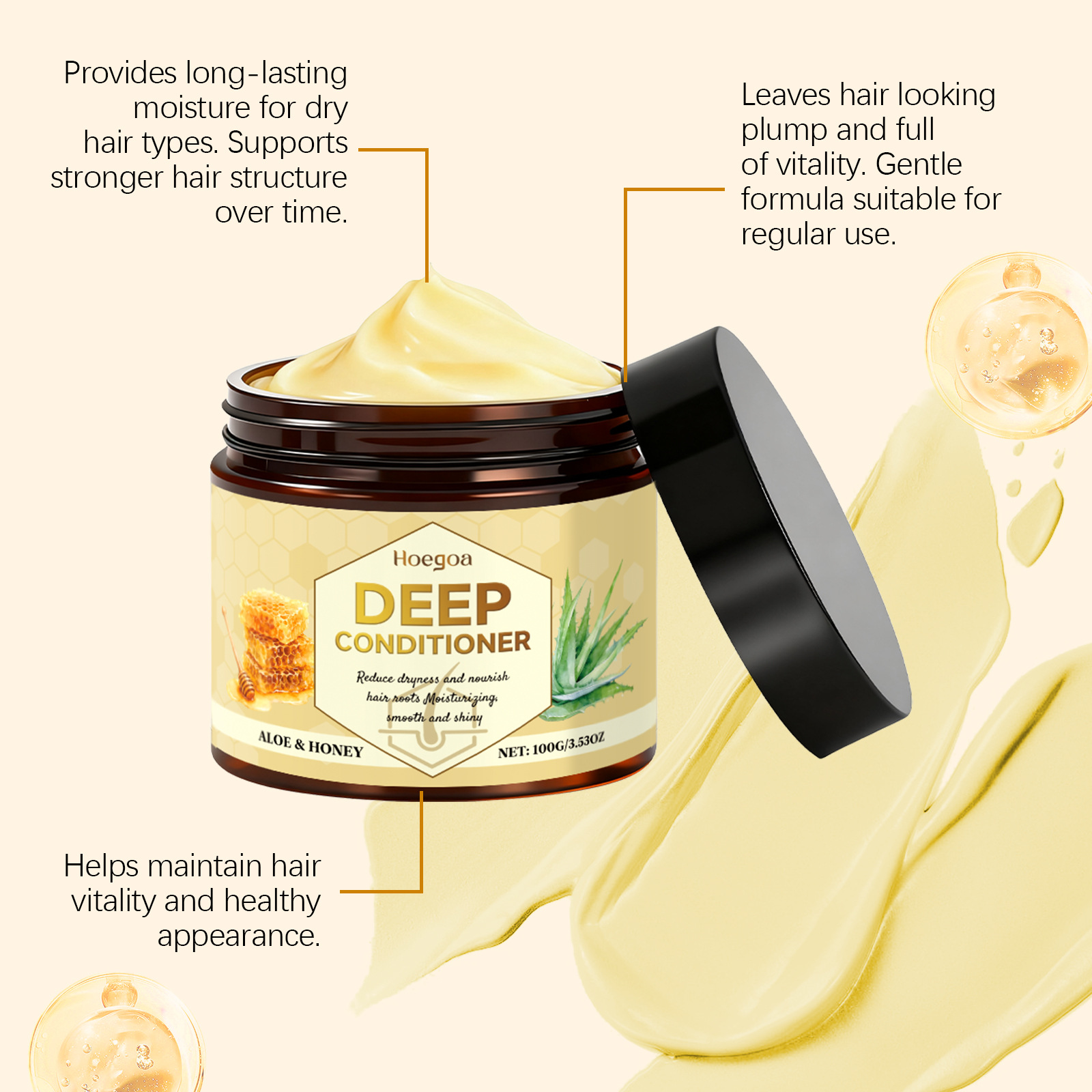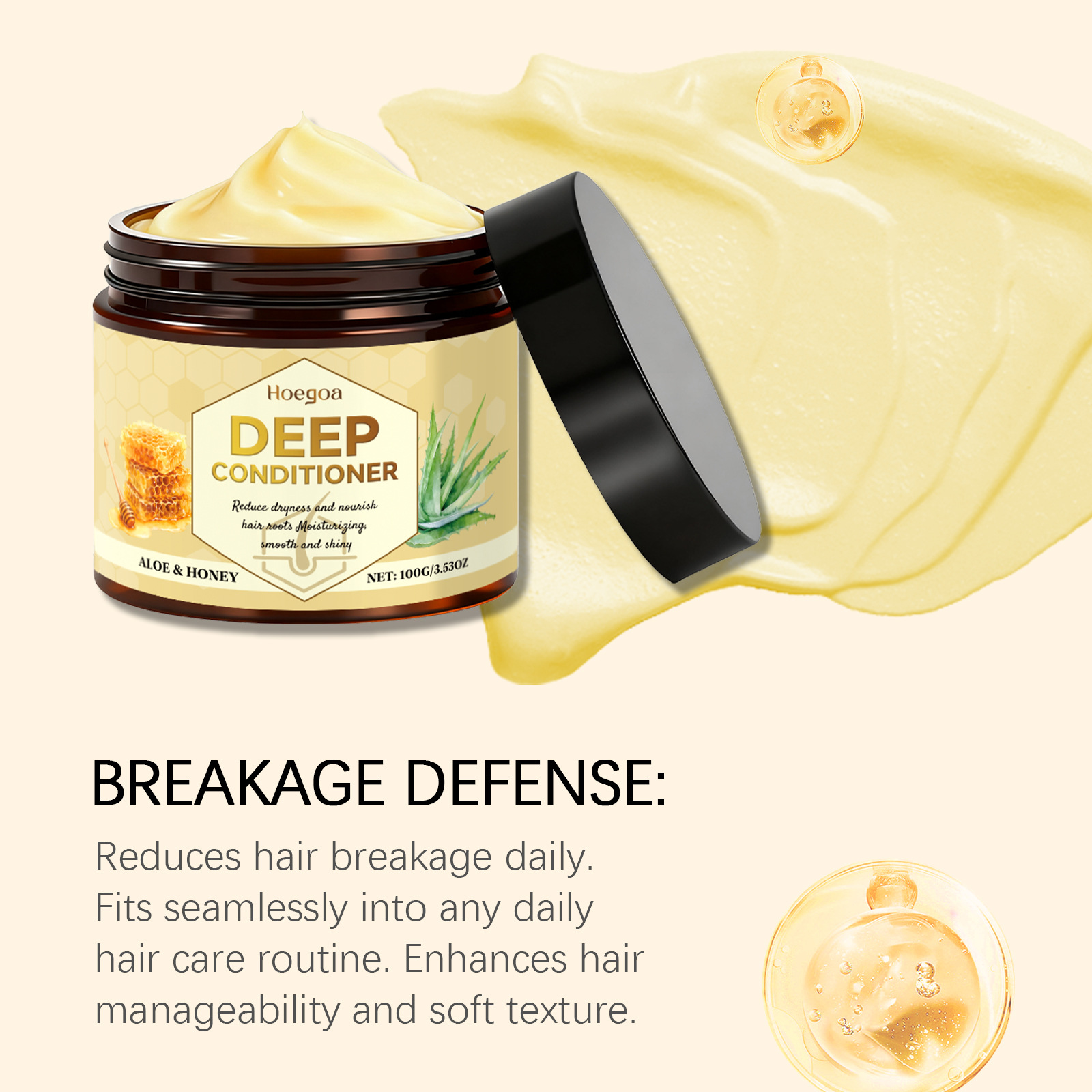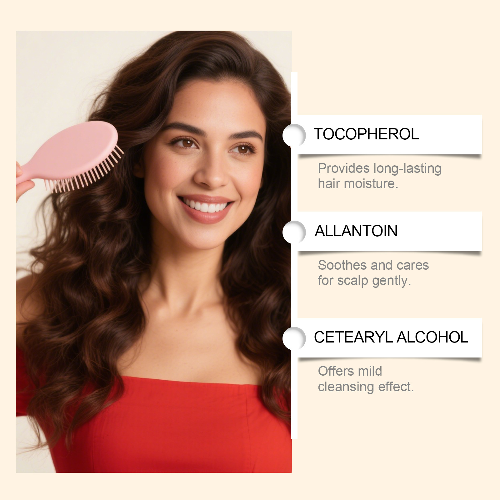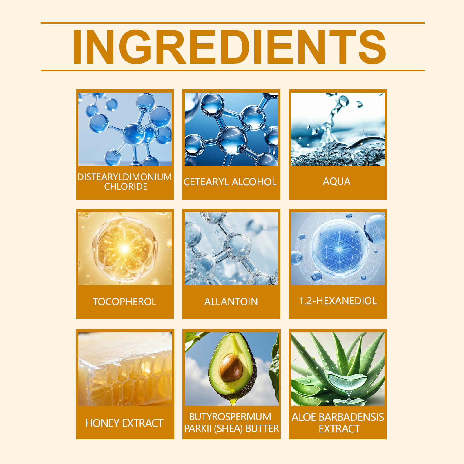 Ingredients: water, cetearyl alcohol, distearyl dimethyl ammonium chloride, 1,2- hexanediol, tocopherol (vitamin E), allantoin, aloe vera extract, shea butter and honey extract.