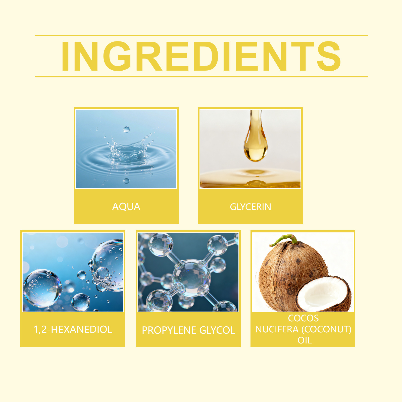 Ingredients: water, propylene glycol, glycerol, 1,2- hexanediol, essence.