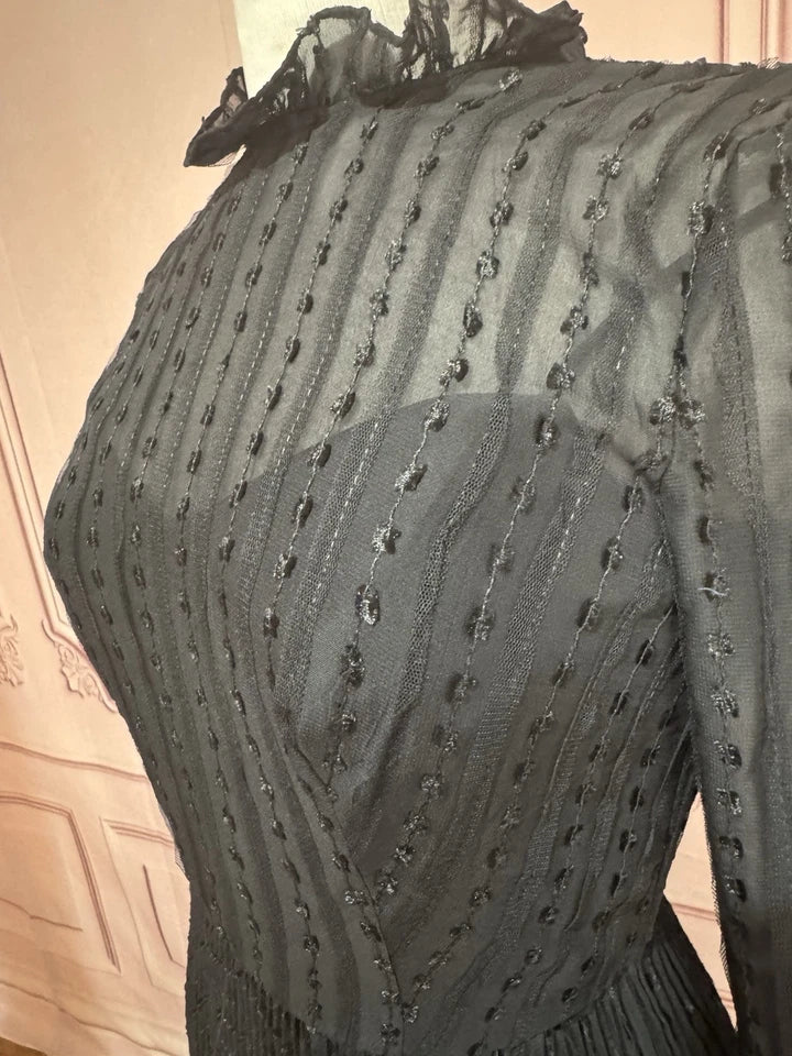 This formal tea-length dress features a unique A-line silhouette in a novelty fabric with an embroidered dot pattern. It has an illusion high neckline with a ruffle collar and sheer long sleeves with ruffled cuffs. The partially lined bodice and fully lined skirt provide comfort and elegance, finishing in a flared, midi-length skirt.