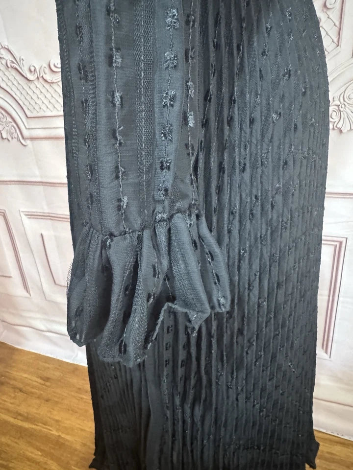 - Fit: A-line silhouette, high illusion neckline, long ruffled flare sleeves