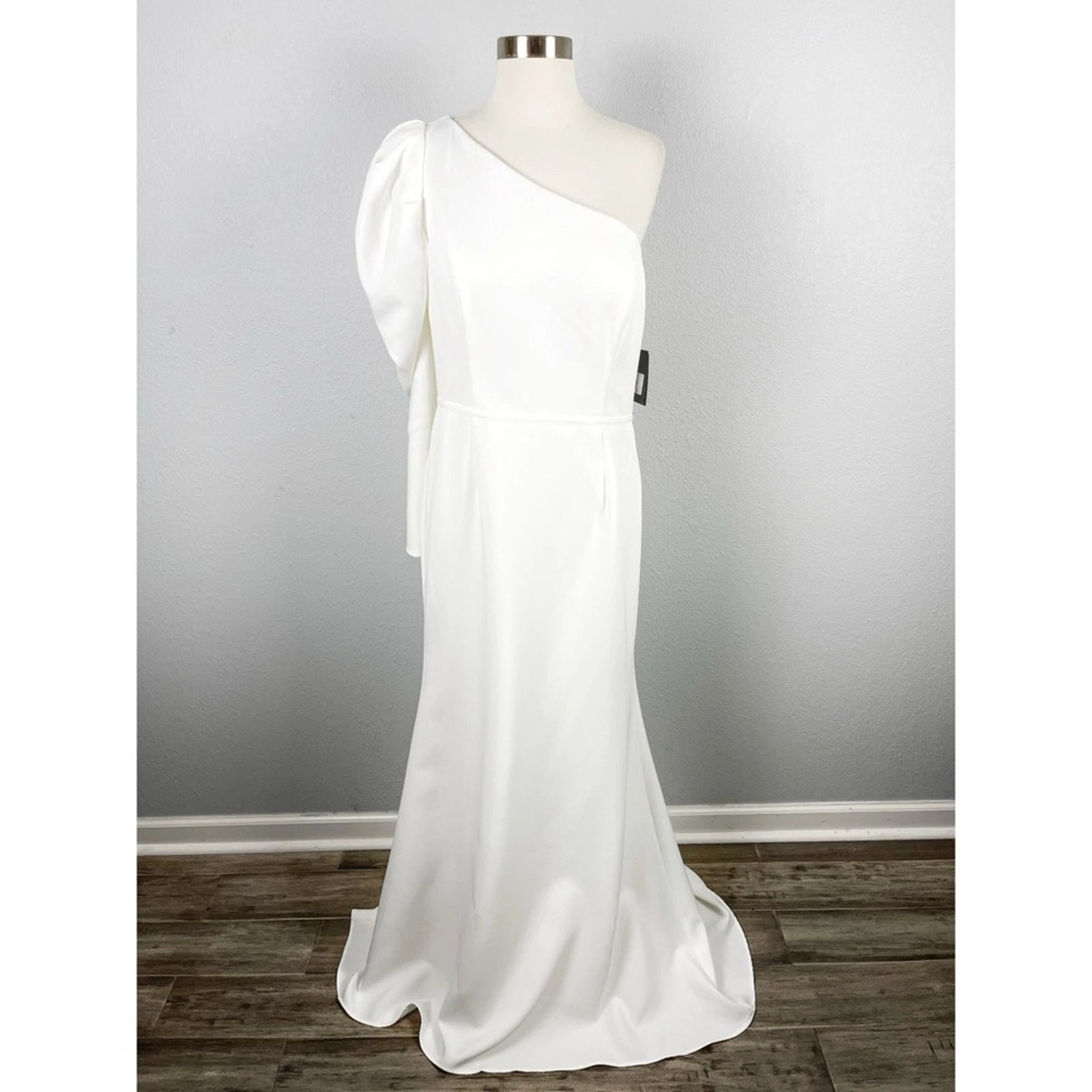 Mac Duggal One-Shoulder Puff Sleeve Trumpet Gown (Style No. 26592) in White