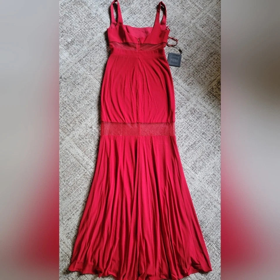 This elegant column gown features a soft and comfortable jersey fabric. The square neckline and sleeveless design enhance the gown's sleek silhouette, while the delicate mesh panel detailing and sheer cutouts add a touch of feminine sophistication. Perfect for any formal occasion.
