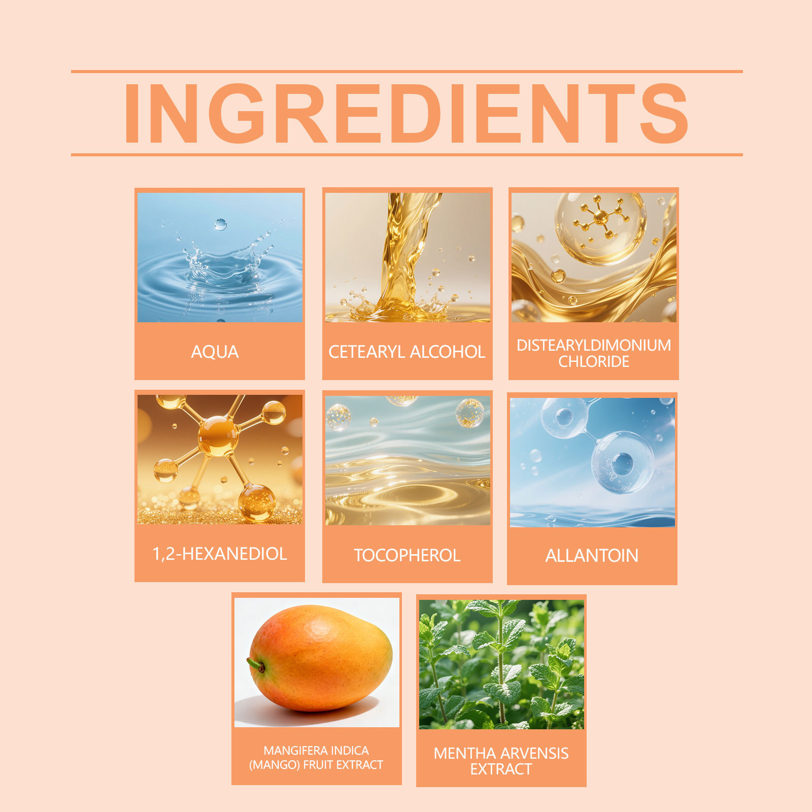 Ingredients: water, cetearyl alcohol, distearyl dimethyl ammonium chloride, 1,2-hexanediol, tocopherol (vitamin E), allantoin, mango fruit extract, field mint extract.