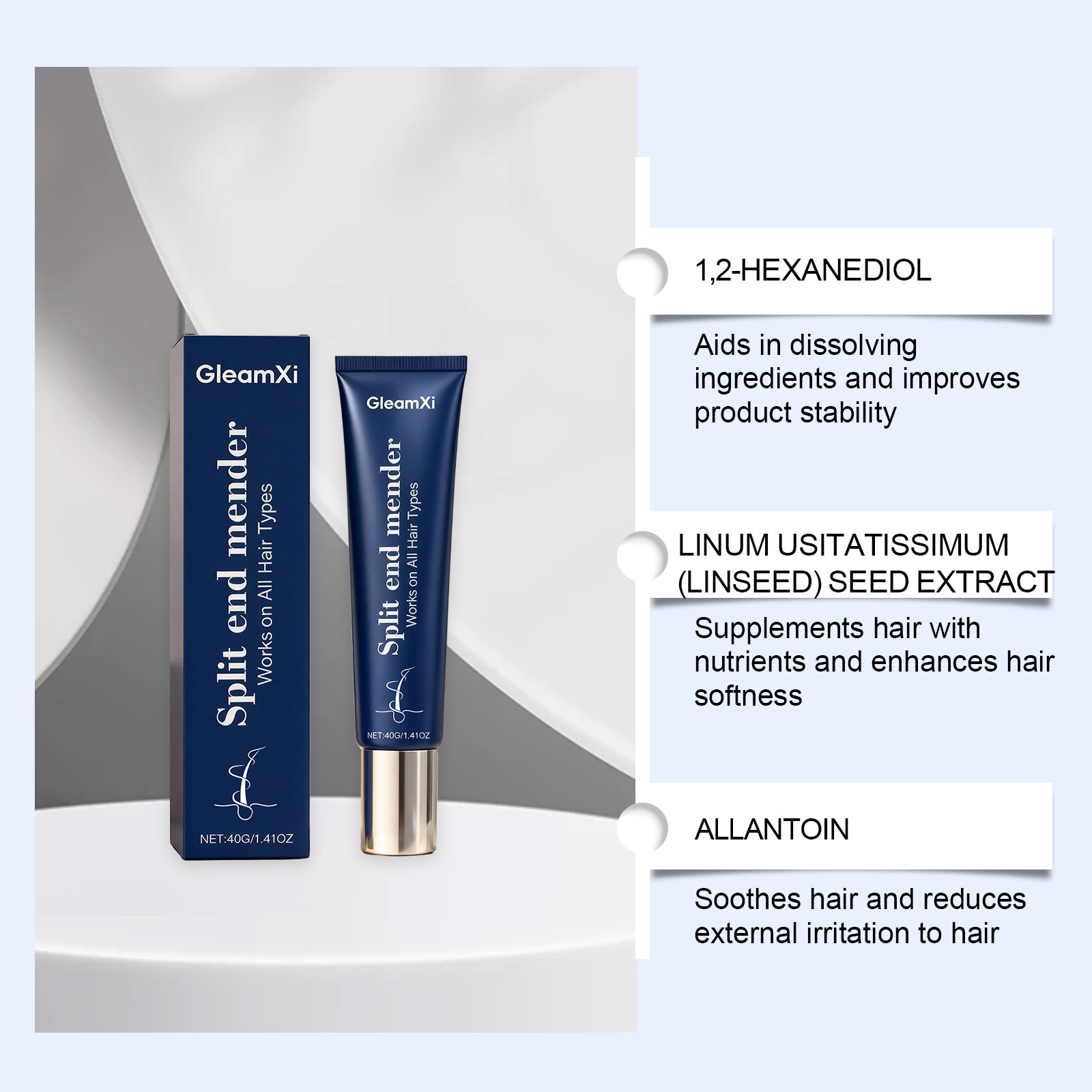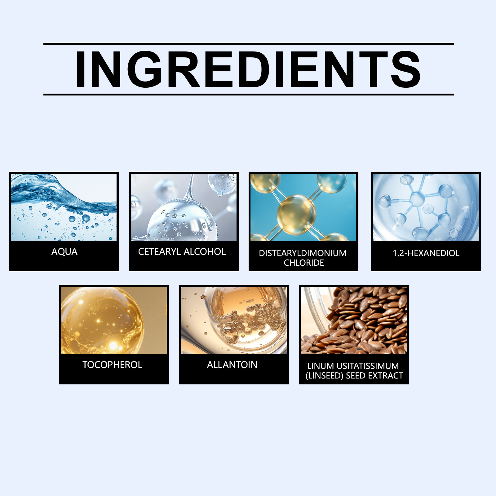 Ingredients: water, cetearyl alcohol, distearyl dimethyl ammonium chloride, 1,2-hexanediol, tocopherol (vitamin E), allantoin and linseed extract.