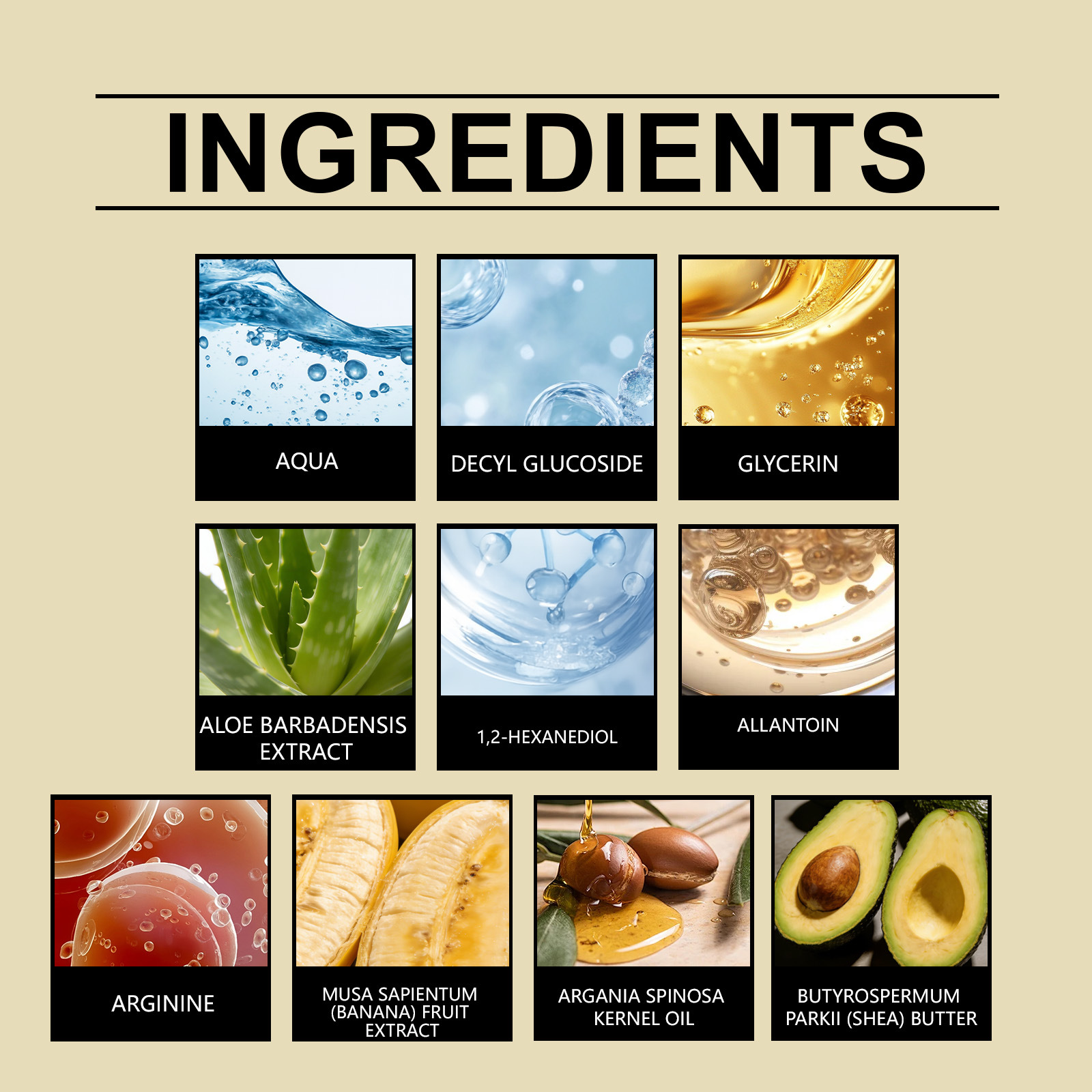 Ingredients: water, decyl glucoside, glycerin, aloe vera extract, 1,2-hexanediol, allantoin, arginine, plantain fruit extract, Aralia elata kernel oil, and shea butter.