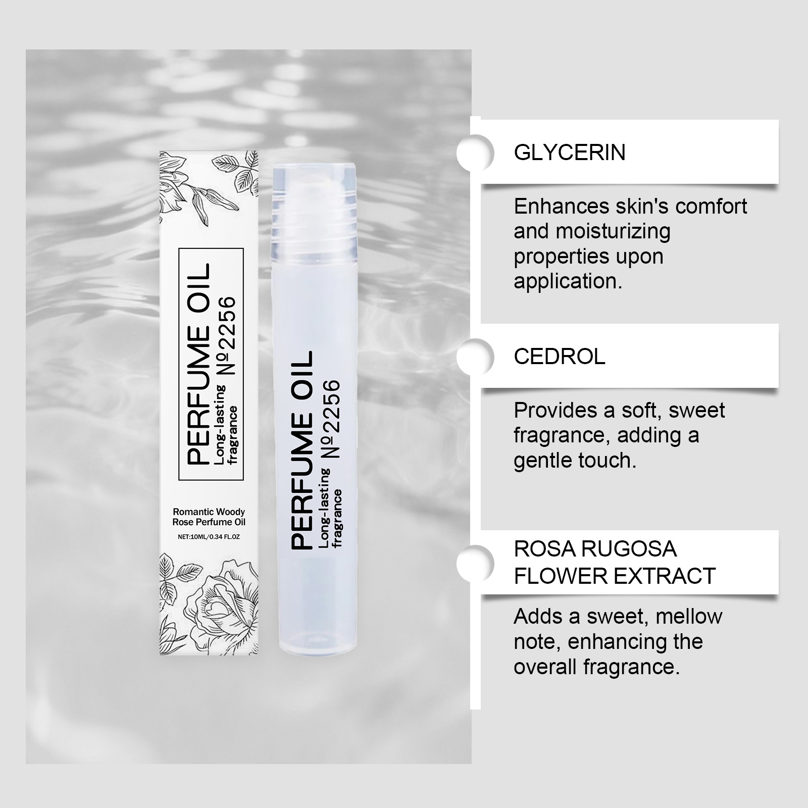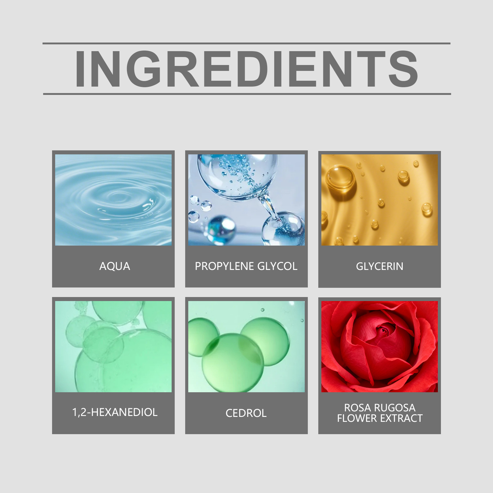 Ingredients: water, propylene glycol, glycerin, 1,2- hexanediol, cedrol, rose extract.