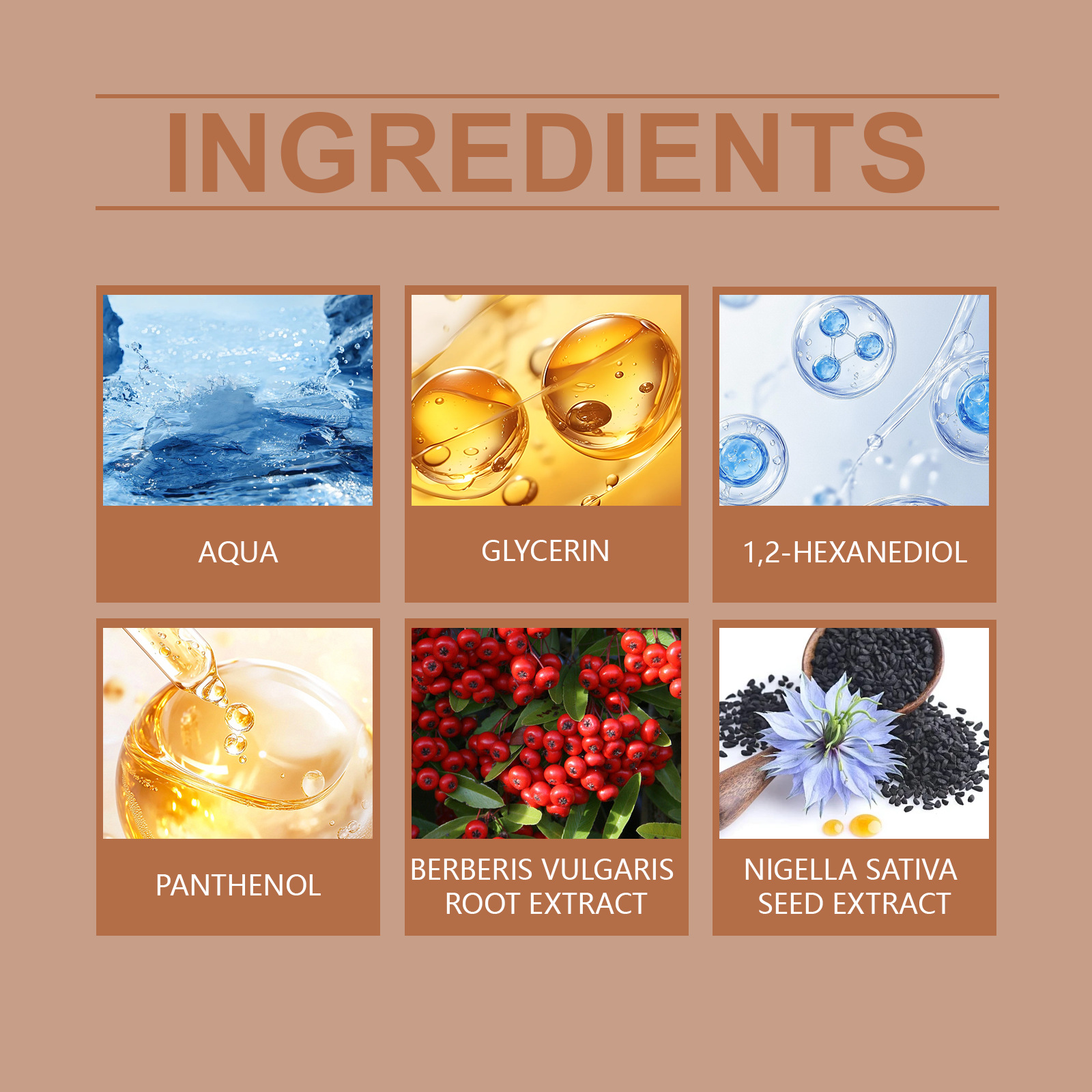 Ingredients: Active ingredients: panthenol, Berberis europaea root extract, and cultivated nigella seed extract.