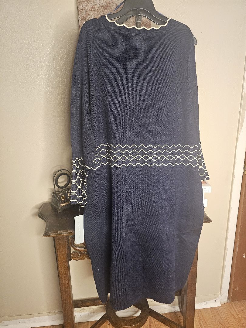 Step out in sophisticated comfort with this charming Navy Knit Sweater Dress. The soft, breathable knit fabric offers a cozy feel perfect for autumn and winter while maintaining an elegant silhouette. The dress features eye-catching cream/ecru contrasting details: a delicate scalloped trim tracing the neckline and a graphic zigzag (chevron) pattern defining the waistline and the decorative cuff edges. The flattering midi length and subtle A-line skirt create a polished look ideal for the office, holiday celebrations, or any smart casual occasion.